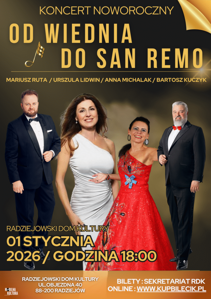 Powitajmy Nowy Rok w wielkim stylu, a to za sprawą Koncertu noworocznego „Od Wiednia do San Remo” w wykonaniu kwartetu artystów: sopranistki Anny Michalak i piosenkarki Urszuli Lidwin, które na scenie czarują nie tylko pięknymi głosami, ale również klasą, elegancją i wspaniałymi strojami starannie dobranymi do charakteru utworów.